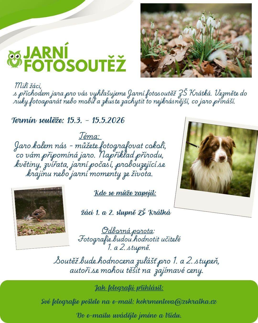 s příchodem jara pro vás vyhlašujeme Jarní fotosoutěž ZŠ Krátká. Vezměte do ruky fotoaparát nebo mobil a zkuste zachytit to nejkrásnější, co jaro přináší.