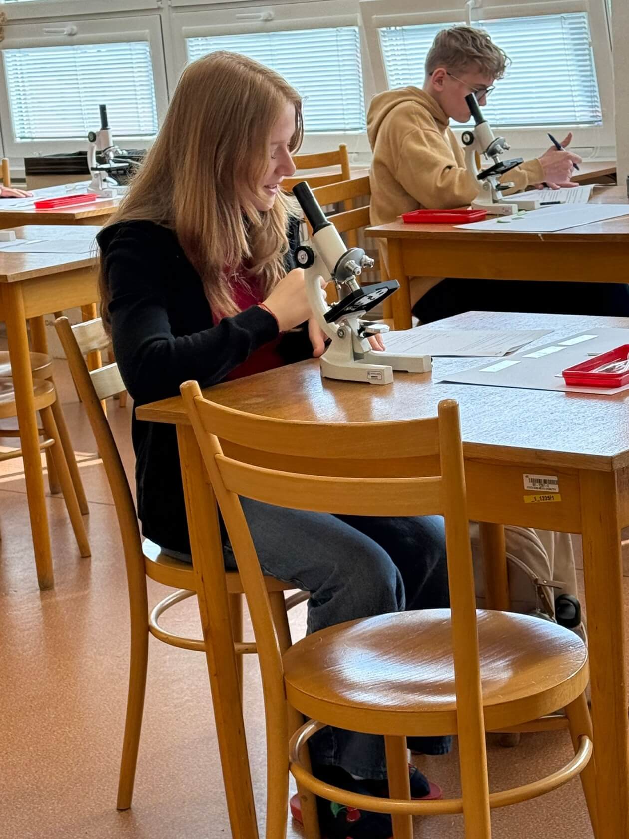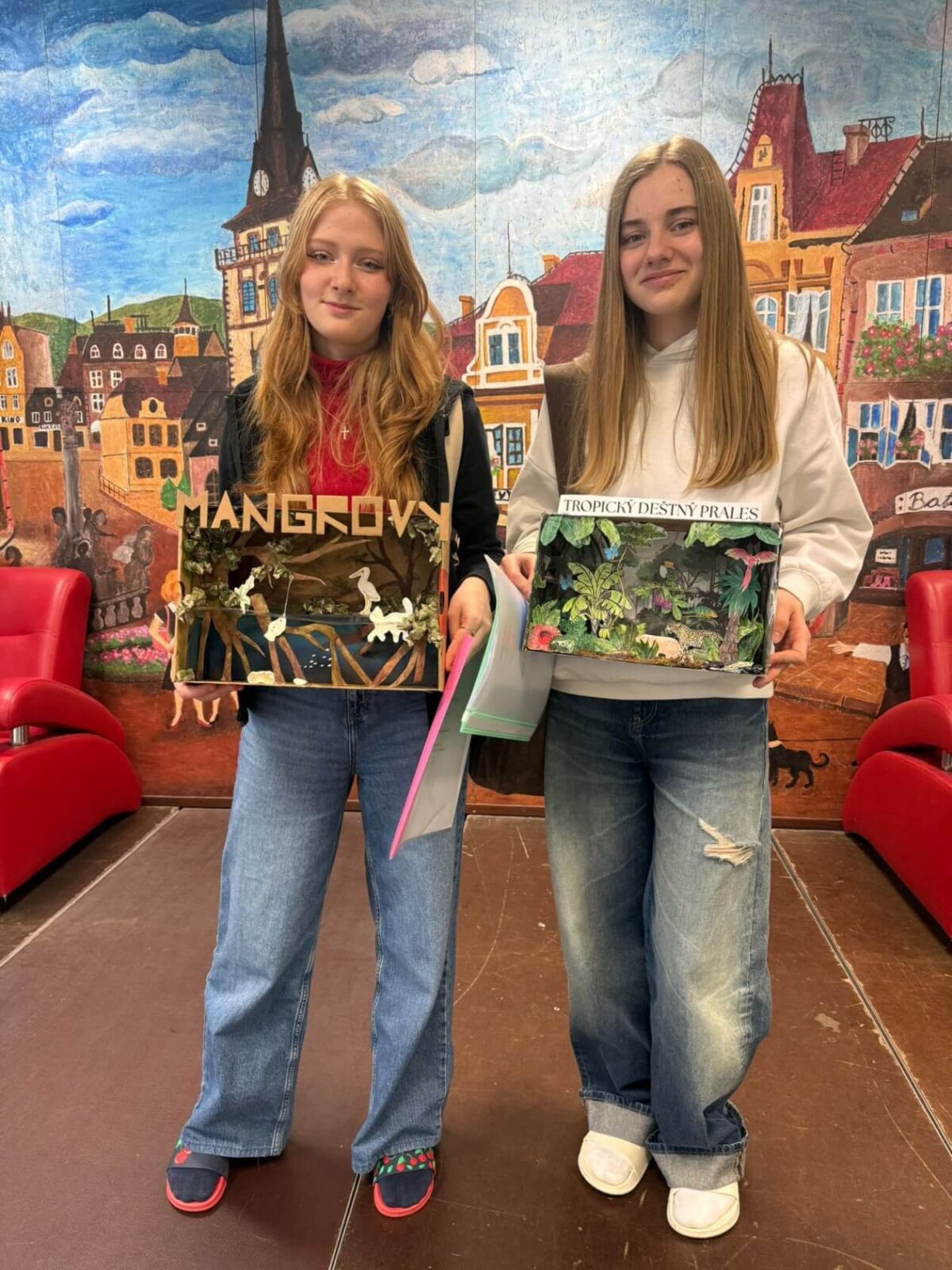 V okresním kole biologické olympiády v Chomutově naši školu reprezentovaly žákyně Sofie Hercegová z 9.A a Anežka Jakubcová z 8.B. Kategorie C pro osmé a deváté ročníky se konala v úterý 31. 3. 2026 v Domečku a skládala se z teoretického testu, poznávání rostliny a živočichů a laboratorní práce. Kromě toho soutěžící museli vypracovat práci na určité téma. Dívky si vybraly téma Okno do světa- musely vyrobit diorama s určitým lesním biomem, ten charakterizovat a potažmo i všechny druhy rostlin a živočichů, které do dioramatu umístily. Oběma se to moc povedlo (viz foto) a získaly za něj plný počet bodů.