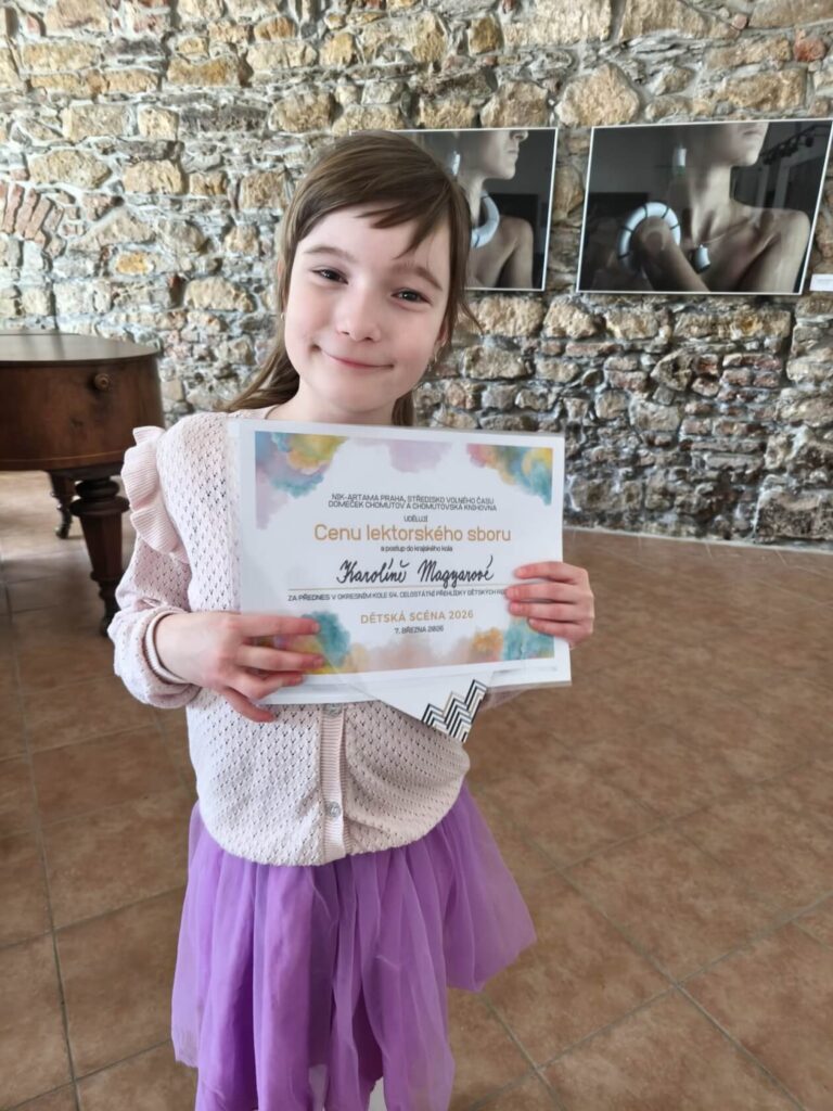 Na celostátní přehlídce dětských recitátorů – Dětská scéna 2026, která se konala 7. března 2026 a byla pořádaná NIK-ARTAMA, Střediskem volného času Domeček Chomutov a Chomutovskou knihovnou, zazářili i naši žáci!