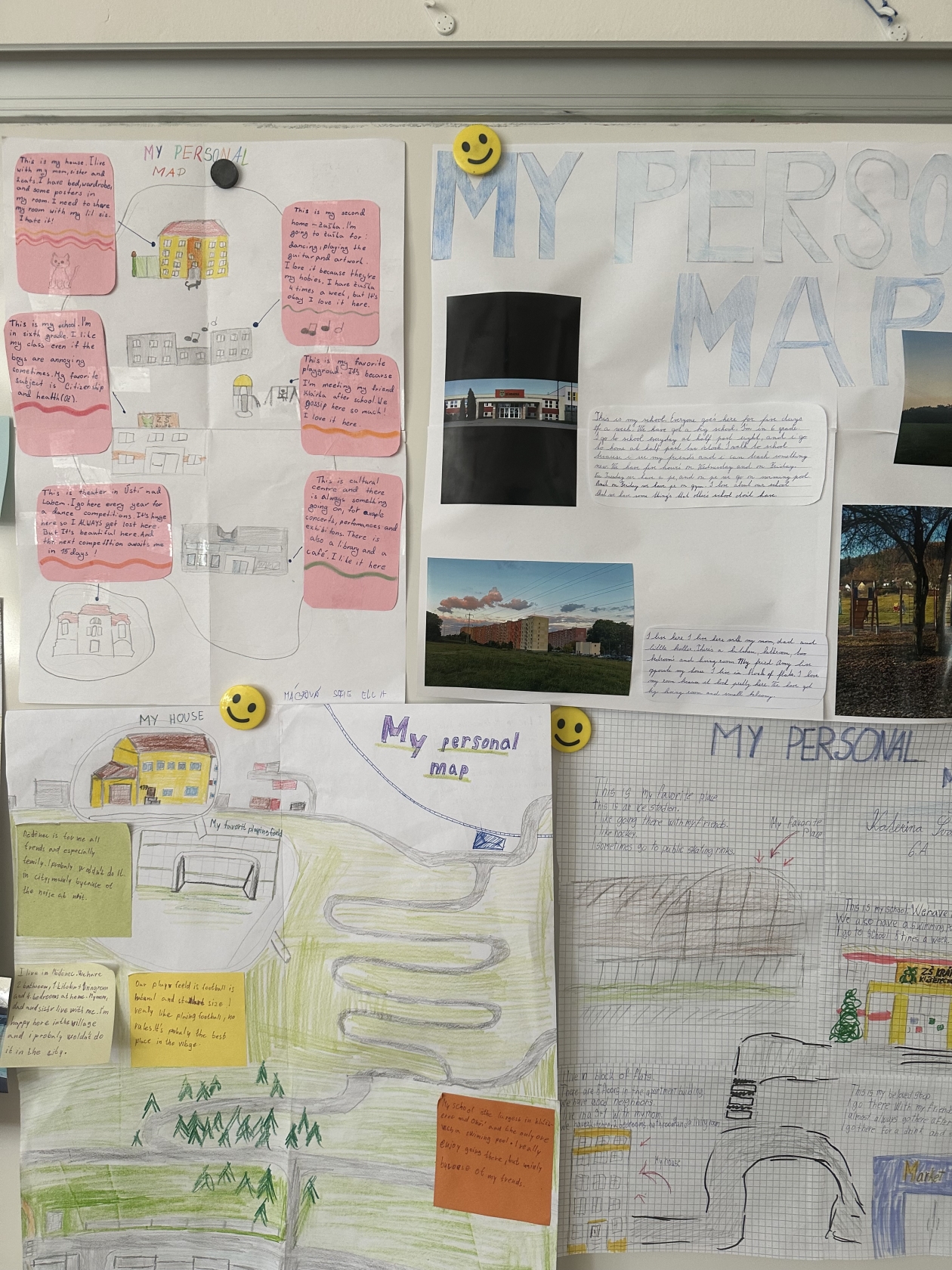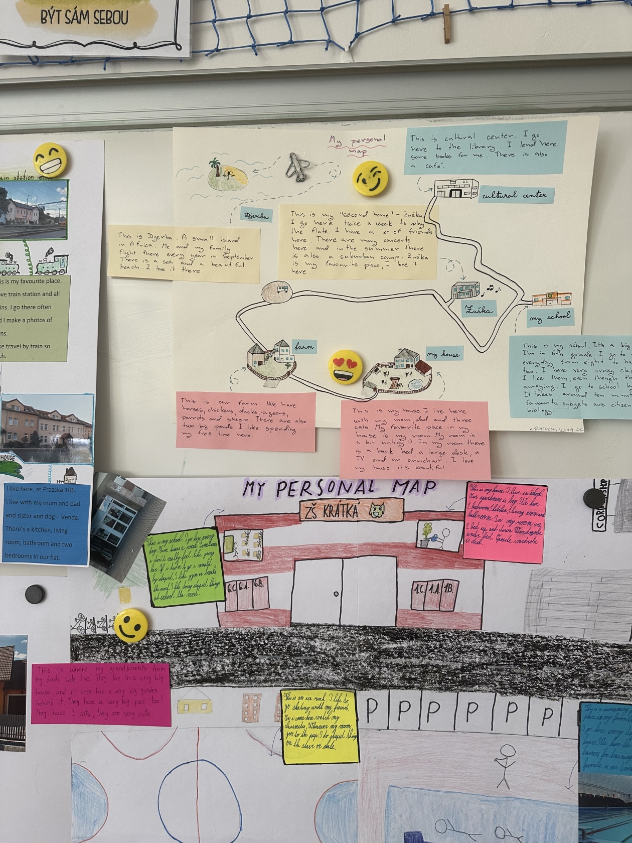 Každá osobní mapa zobrazuje místa, která jsou pro děti důležitá. Jsou zde rodinné domy, byty, škola, sportovní kluby, kroužky, babiččin dům,oblíbene obchody a dokonce i místa k letní relaxaci. Na mapach si můžete prohlednout barevné kresby, fotografie a nápisy. Děti se při prezentaci své osobní mapy podělily o stručné informace o místech, která jsou pro ně důležitá a blízká jejich srdci. Během práce na projektu si školáci zlepšili znalosti anglického jazyka a projevili kreativitu.
