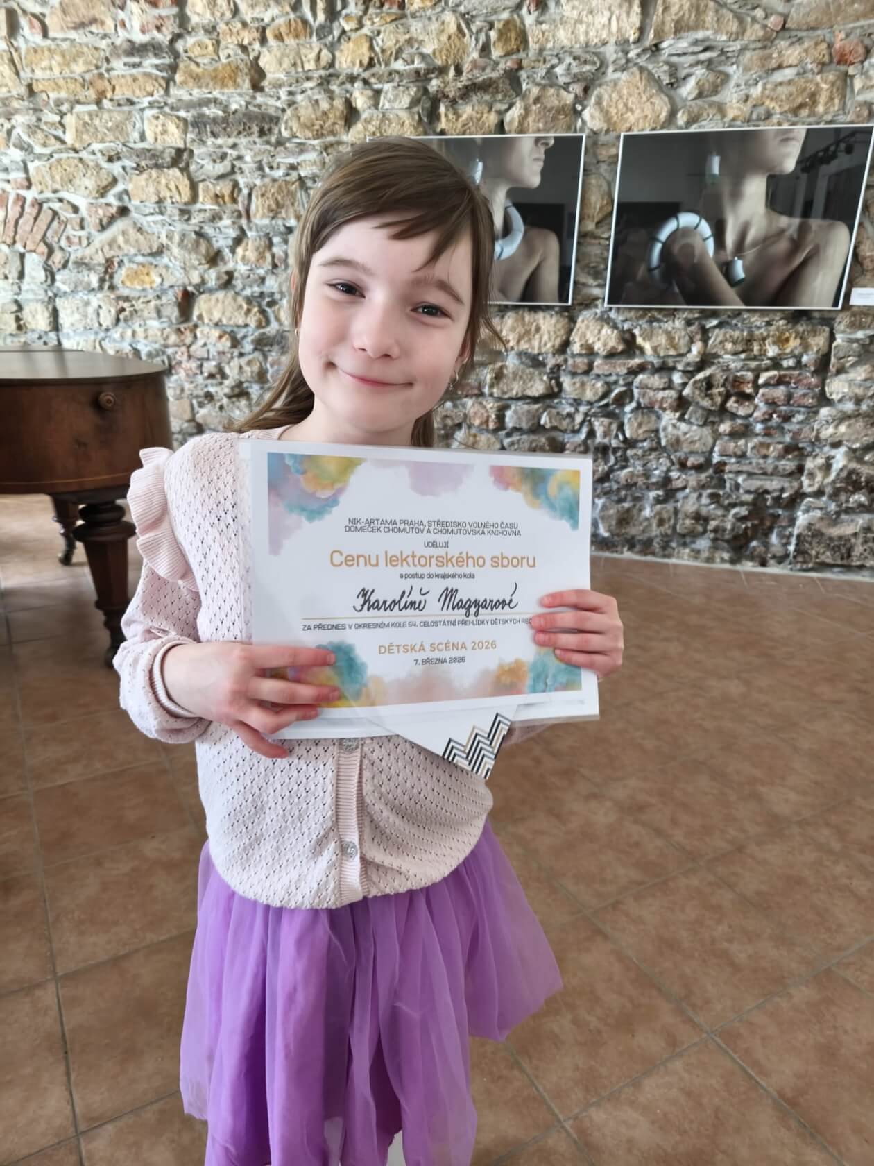 Na celostátní přehlídce dětských recitátorů – Dětská scéna 2026, která se konala 7. března 2026 a byla pořádaná NIK-ARTAMA, Střediskem volného času Domeček Chomutov a Chomutovskou knihovnou, zazářili i naši žáci!